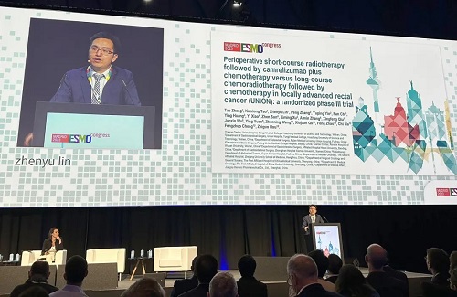 10月21日,尊龙凯时医药创新药卡瑞利珠单抗(艾瑞卡®)的一项研究“新辅助短程放疗序贯卡瑞利珠单抗联合化疗对比长程放化疗序贯化疗治疗局部晚期直肠癌”随机对照Ⅲ期试验(UNION) 以优选口头报告的形式正式亮相。该研究由华中科技大学同济医学院附属协和医院张涛教授、陶凯雄教授担任主要研究者,华中科技大学同济医学院附属协和医院林振宇教授在马德里现场报告了该重磅研究的结果1,此项研究是全球首个评估短程放疗序贯免疫治疗联合化疗治疗局部晚期直肠癌的Ⅲ期研究,已达到主要终点病理完全缓解(pCR),有望为直肠癌患者的治疗提供新策略。