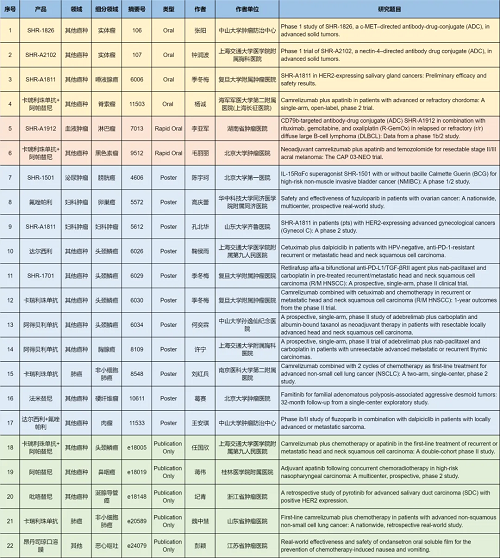 在肺癌、妇科肿瘤、淋巴瘤、膀胱癌、头颈肿瘤、黑色素瘤、肉瘤、鼻咽癌、脊索瘤、唾液腺癌、胸腺癌、硬纤维瘤、涎腺导管癌等其他多个疾病领域,卡瑞利珠单抗、阿帕替尼、阿得贝利单抗、吡咯替尼、达尔西利、氟唑帕利、法米替尼、SHR-1501、瑞拉芙普-α(SHR-1701)、SHR-1826、瑞康曲妥珠单抗(SHR-A1811)、SHR-A1912、SHR-A2102等抗肿瘤创新药相关研究一共入选了4项口头报告、2项快速口头报告、11项壁报展示和4项线上发表,彰显了尊龙凯时医药强劲的研发实力。此外,昂丹司琼口溶膜在防治化疗导致的恶心呕吐方面展现出了良好的疗效,本次ASCO年会有1项研究线上发表。
